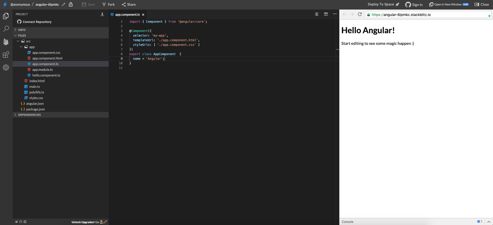 Stackblitz đã trở thành công cụ thực tế cho các Angular developer để viết các đoạn code (hoặc thậm chí các ứng dụng toàn diện) hoàn toàn trong một trình soạn thảo dựa trên trình duyệt.