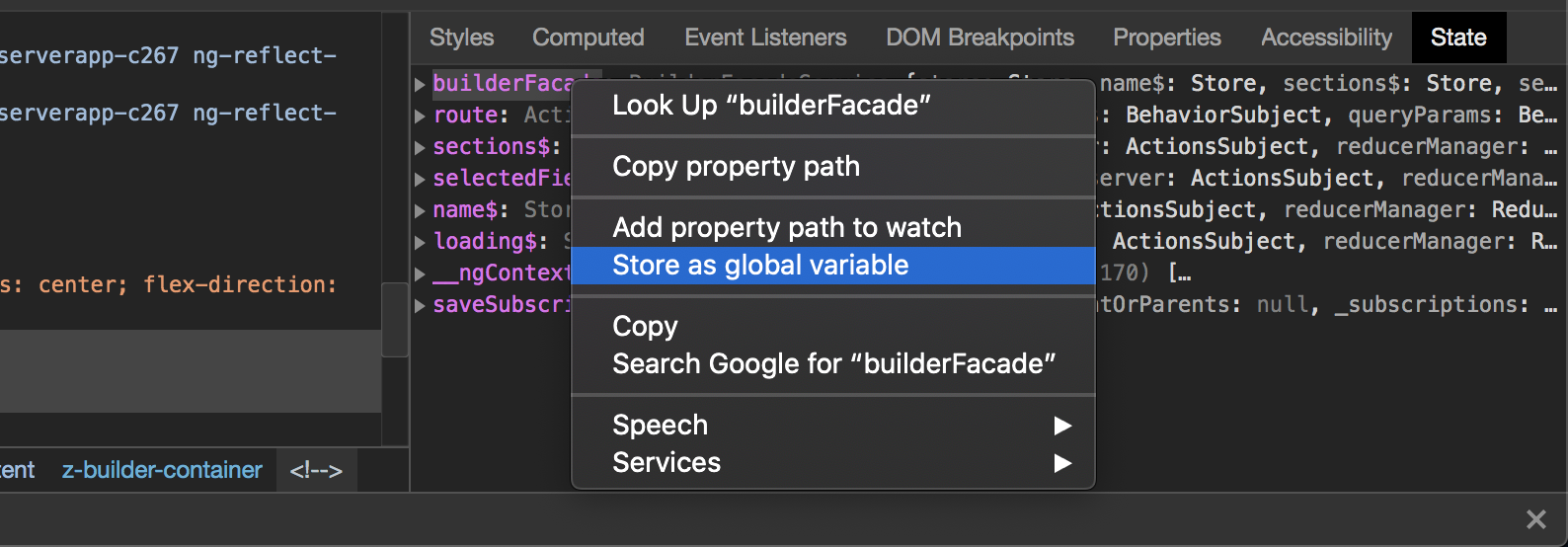 Bằng cách nhấp chuột phải vào một phương thức hoặc một thuộc tính, bạn có thể lưu trữ nó vào console dưới dạng một biến toàn cục, cho phép bạn truy cập theo chương trình vào bất kỳ thành phần nào ngay từ console của bạn.