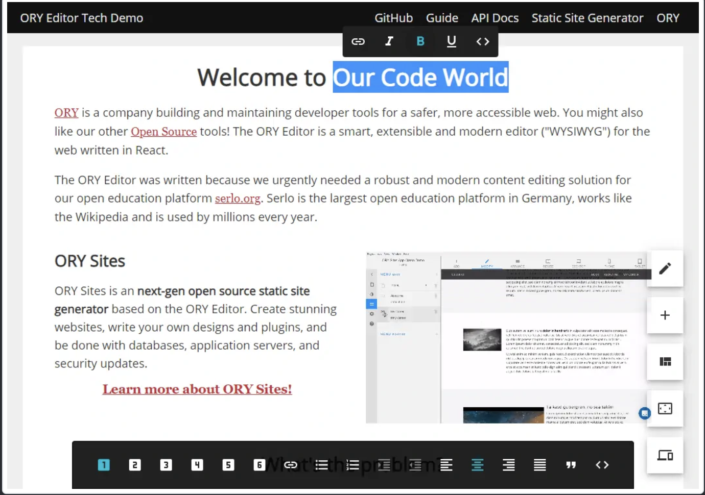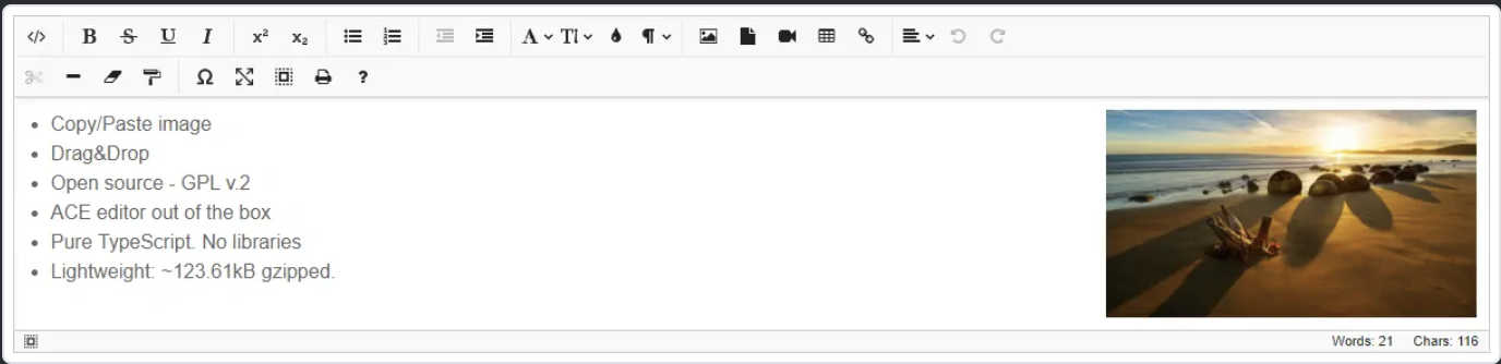 Trình soạn thảo văn bản đa dạng thức JavaScript hiện đại với kiến trúc mô-đun. Giao diện người dùng và các tính năng rõ ràng của nó cung cấp UX WYSIWYG hoàn hảo để tạo nội dung ngữ nghĩa.