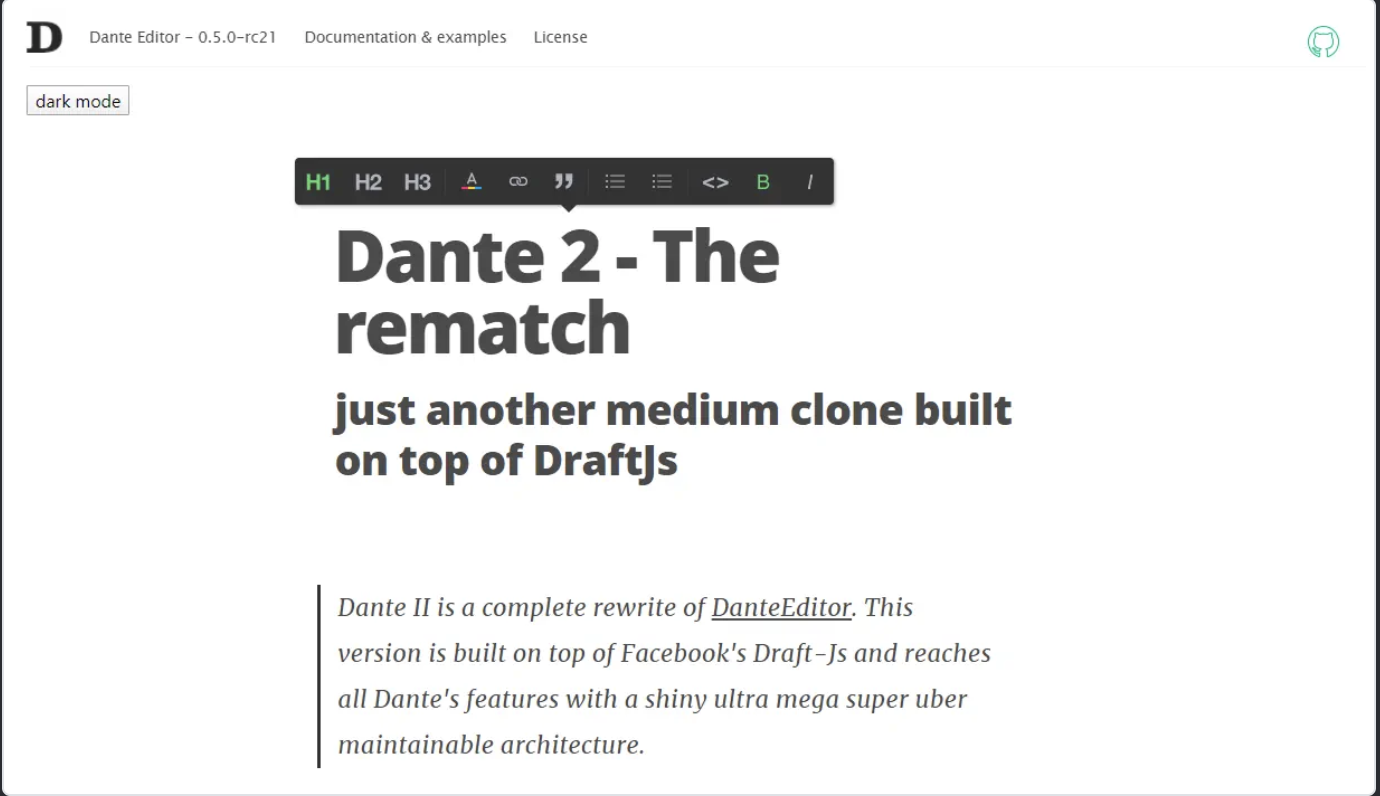 Dante2 là bản viết lại hoàn chỉnh của trình soạn thảo dante trong bản draft-js (chỉ là một bản sao phương tiện khác được xây dựng trên bản nháp của DraftJs). Phiên bản trước của Dante phụ thuộc rất nhiều vào thao tác DOM gây ra sự kết hợp giữa trình bày và logic. Ngay cả với hệ thống plugin mô-đun của họ, điều kiện này giả sử mô hình sphagetti hoạt động với mọi tính năng. Vấn đề lớn nhất với cách tiếp cận này là: nếu bạn muốn thực hiện một thay đổi ảnh hưởng đến việc trình bày nội dung người dùng của mình, giả sử bạn có thể muốn thay đổi đánh dấu mặc định cho các đoạn văn, có thể bạn sẽ kết thúc việc cập nhật tất cả nội dung trong cơ sở dữ liệu của mình, bởi vì đối phó với "chỉ DOM" giả sử rằng bạn sẽ lưu html vào cơ sở dữ liệu, phải không?
