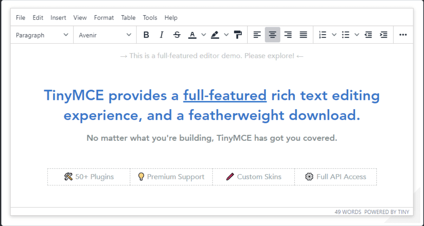 TinyMCE là một nền tảng web độc lập kiểm soát trình chỉnh sửa Javascript HTML WYSIWYG được phát hành dưới dạng Mã nguồn mở theo LGPL. Các nhà phát triển có thể sử dụng TinyMCE trong các dự án web của riêng họ để cho phép người dùng cuối thêm / chỉnh sửa nội dung vào trang web hoặc ứng dụng khác. TinyMCE có thể tùy chỉnh, vì vậy bạn có thể chỉ định nút nào trên thanh công cụ, v.v. Nhiều tùy chọn thanh công cụ có sẵn dưới dạng plugin và bạn chỉ cần thêm các tham số thích hợp từ bên trong JavaScript khi bạn gọi trình chỉnh sửa. Dự án chính thức cũng cung cấp một thành phần React mà bạn có thể dễ dàng cài đặt và sử dụng trong dự án của mình.