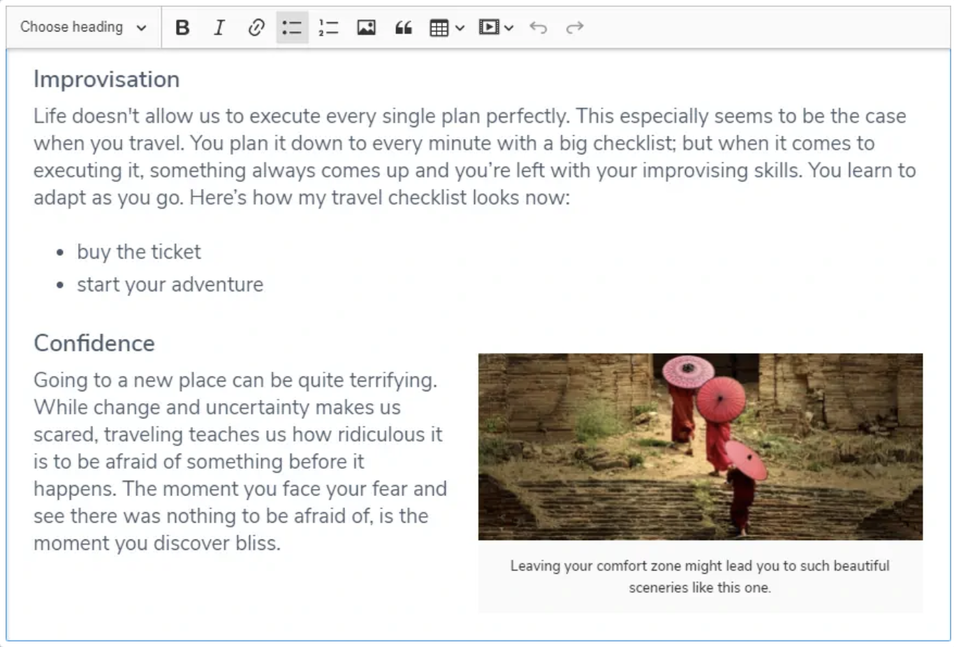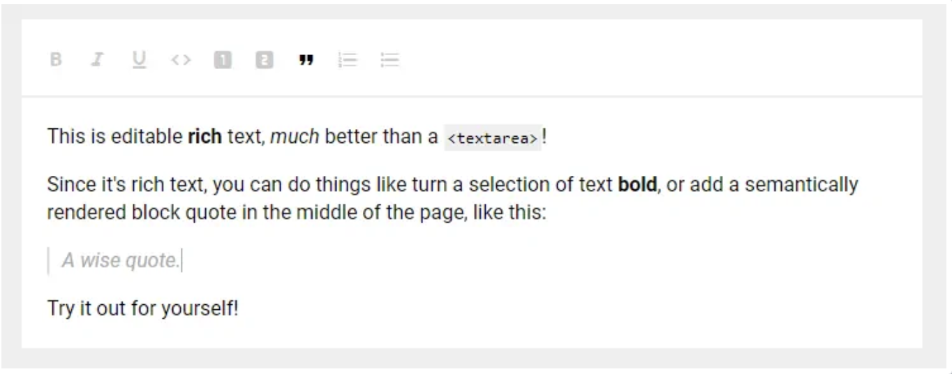 Nó thực hiện điều này bằng cách triển khai giao diện chỉnh sửa kiểu WYSIWYG cho các tài liệu có cấu trúc và hạn chế hơn so với HTML thuần túy. Bạn có thể tùy chỉnh hình dạng và cấu trúc của tài liệu mà trình soạn thảo của bạn tạo ra và điều chỉnh chúng theo nhu cầu của ứng dụng của bạn.
