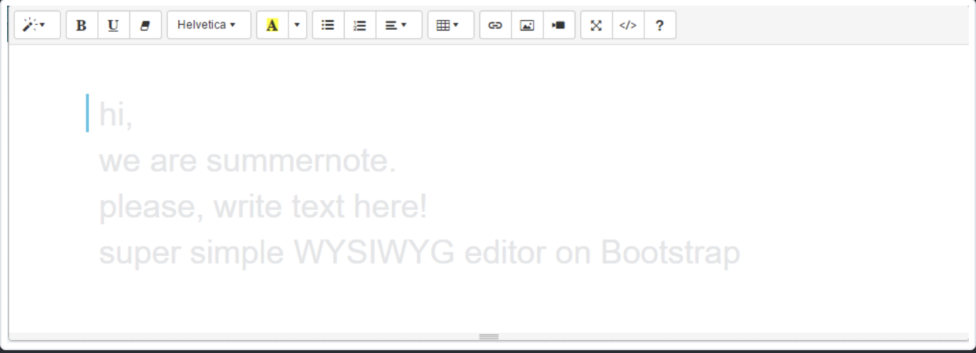 Summernote là một trình soạn thảo WYSIWYG bootstrap siêu đơn giản. Yêu cầu bootstrap và jQuery, Summernote hỗ trợ các tính năng tự động hoàn thành, gợi ý giúp bạn đánh máy.