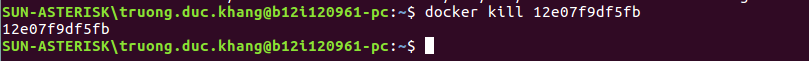 Command này sẽ dừng 1 container ngay lập tức. Sự khác nhau giữa 'docker kill' và ' docker stop'. Docker stop sẽ cho container thời gian để kết thúc.