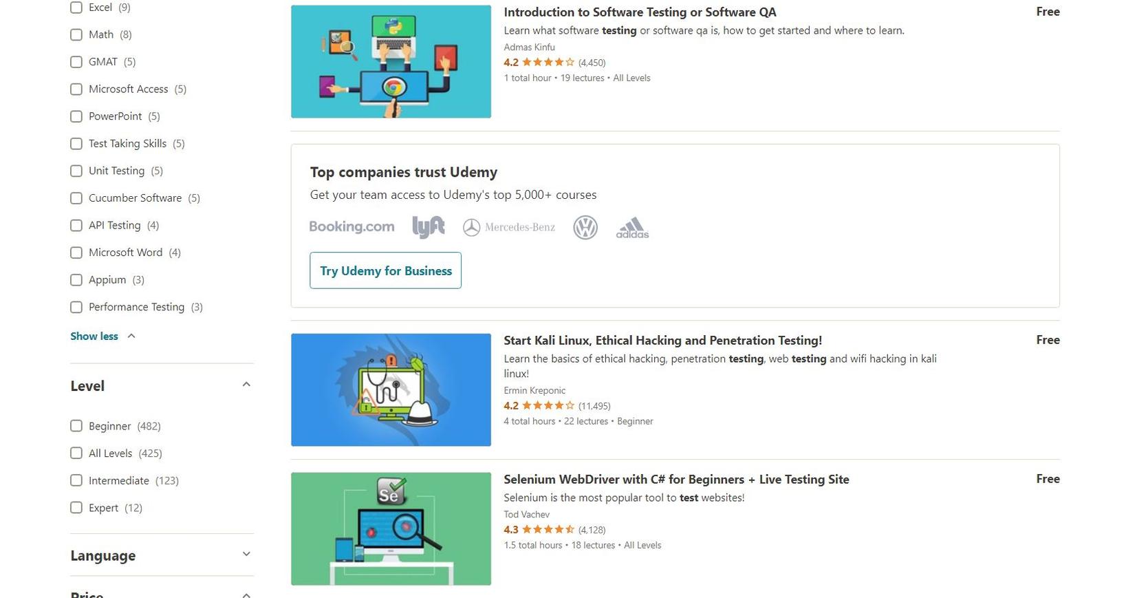 Udemy là một trong những nền tảng kiến thức online chất lượng nhất hiện nay. Đây là lựa chọn lý tưởng phù hợp cho các bạn thích học qua video để linh hoạt giờ giấc. Hầu hết các khóa học trên Udemy thường phải tốn một khoản phí nhỏ. Tuy nhiên, nền tảng giáo dục online này vẫn có những khóa học hoàn toàn miễn phí dành cho bạn. Những khóa học miễn phí này thường là những khóa cơ bản hoặc của những giảng viên mới. Vì vậy, bạn có thể tận dụng điều này để tìm hiểu về kiến thức nền tảng của nghề tester.