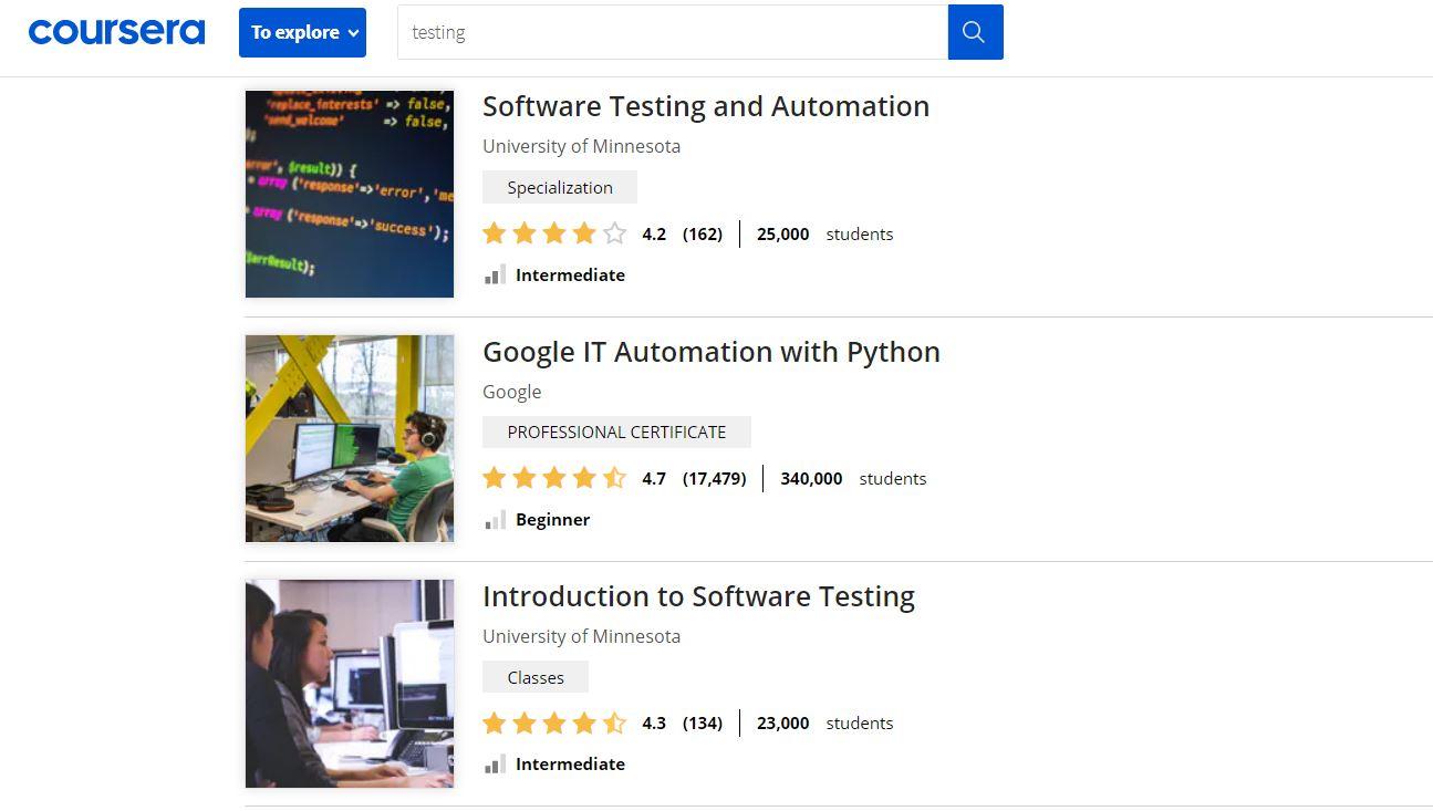 Coursera là một trong những nền tảng học online nổi tiếng với số lượng khóa học lớn và đa ngành nghề, bao gồm lập trình nói chung và kiểm thử phần mềm nói riêng. Mỗi khóa học đều có lộ trình cụ thể, rõ ràng kèm theo bài tập và dự án thực hành. Các giảng viên trên Coursera đều có nhiều kinh nghiệm trong ngành và đang giảng dạy tại các trường đại học. Hơn nữa, điểm nổi bật của Coursera là bạn có thể truy cập miễn phí bất kỳ khóa học nào. Tuy phải trả phí để nhận chứng chỉ của khóa học trên Coursera nhưng cũng tương đối không quá “chát”.
