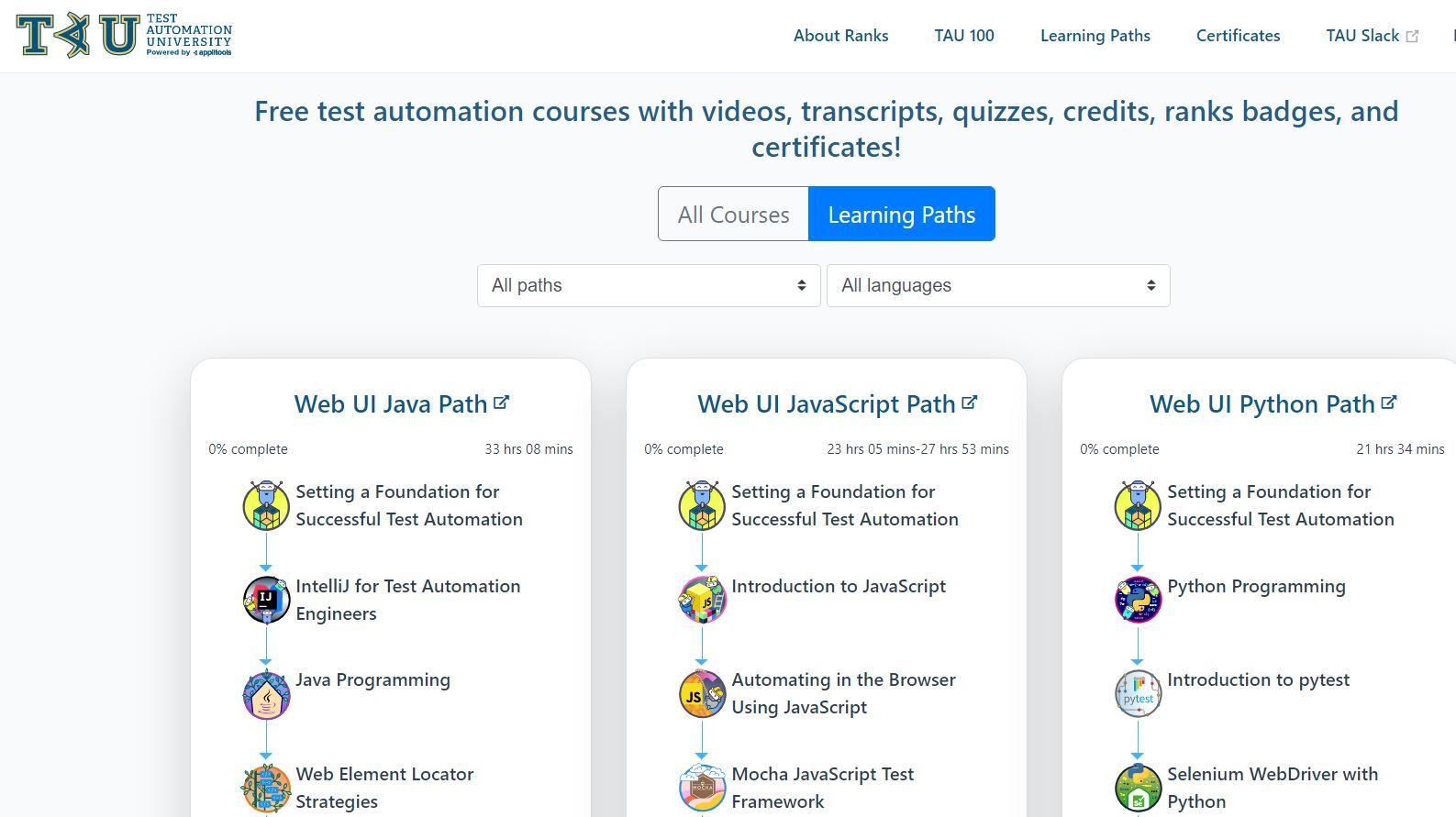 Nếu bạn đang muốn tìm một website chuyên về mảng kiểm thử tự động thì đây chính là lựa chọn dành cho bạn. Test Automation University cung cấp hàng loạt các khóa học kiểm thử hoàn toàn miễn phí. Ngoài ra, website này cũng bao gồm nhiều chủ đề khác như AI (Artificial Intelligence – trí tuệ nhân tạo), lập trình web, ứng dụng di động và nhiều ngôn ngữ lập trình từ cơ bản đến nâng cao.