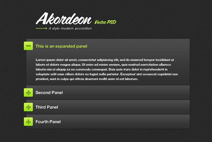 Accordion này được style theo phong cách menu trên website. Ý tưởng đằng sau Akordeon là cung cấp một giao diện nhẹ và có thể tùy chỉnh cho các collapsible panels có thể chứa bất kỳ loại dữ liệu nào trong một không gian hạn chế.
