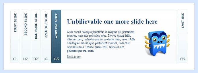 Đây là 1 accordion nằm ngang thay vì hoạt động vertical như thông thường. Bên cạnh đó, plugin này có layout responsive khi bạn set { responsive : true } trong phần option của plugin. Lúc này, accordion sẽ tự điều chỉnh chiều dài của nó sao cho phù hợp với kích thước của page. Plugin này dễ dàng sử dụng trên mobile hoặc là các thiết bị cầm tay khác khi định hướng của thiết bị thay đổi.