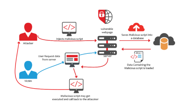 => Cơ chế : Hacker sẽ nhập vào ô Input mã script, sau đó server sẽ lưu vào database và khi người dùng gửi request lên server thì server sẽ load dữ liệu từ database ra để xử lý và mã script đó được thực thi và hacker có thể lấy được cookie của người dùng hoặc chuyển hướng người dùng đến web nguy hiểm hơn.