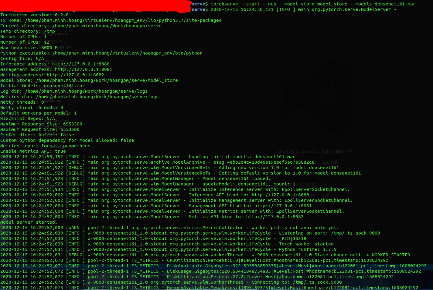 start: bắt đầu phiên làm việc của TorchServestop: kết thúc phiên làm việc của TorchServemodel-store: nơi chứa mô hình, cụ thể là folder chứa file có đuôi.marban nãymodels: mô hình cần load, ví dụdensenet161.marlog-config: file config cho logts-config: file config đặc biệt cho TorchServe, như điều chỉnh port chẳng hạnforeground: show log khi chạy trên terminal, nếu disable ts sẽ chạy ẩnncs: disable snapshot