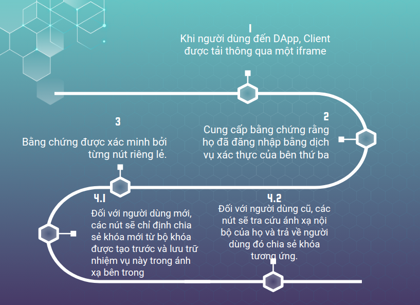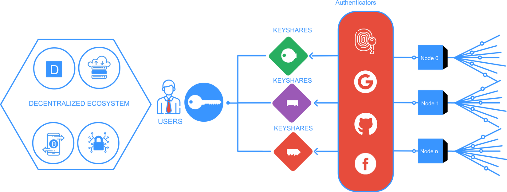 Như đã nói ở phần Giới thiệu, để tương tác với hệ sinh thái phi tập trung (Dapps), user cần phải có một địa chỉ ví để định danh. Nhìn vào hình trên các bạn có thể thấy rằng chiếc khóa định danh của user được kết hợp từ nhiều phần để trở thành một chiếc khóa định danh thỏa mãn => Đó là cách thức Torus hoạt động để tránh việc khóa định danh có thể bị hack dễ dàng, mỗi phần của chiếc khóa được lưu trữ ở các node khác nhau trong mạng của Torus và được Authenticate thông qua các bên thứ 3 như Google, Facebook, Giithub, hoặc vân tay của người dùng, ...