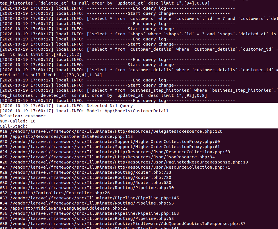 Vậy là xong. Bây giờ mỗi khi bạn run api thì hệ thống sẽ log query vào laravel.log, trường hợp xuất hiện N+1 query thì sẽ hiển thị thêm đoạn INFO như thế này: