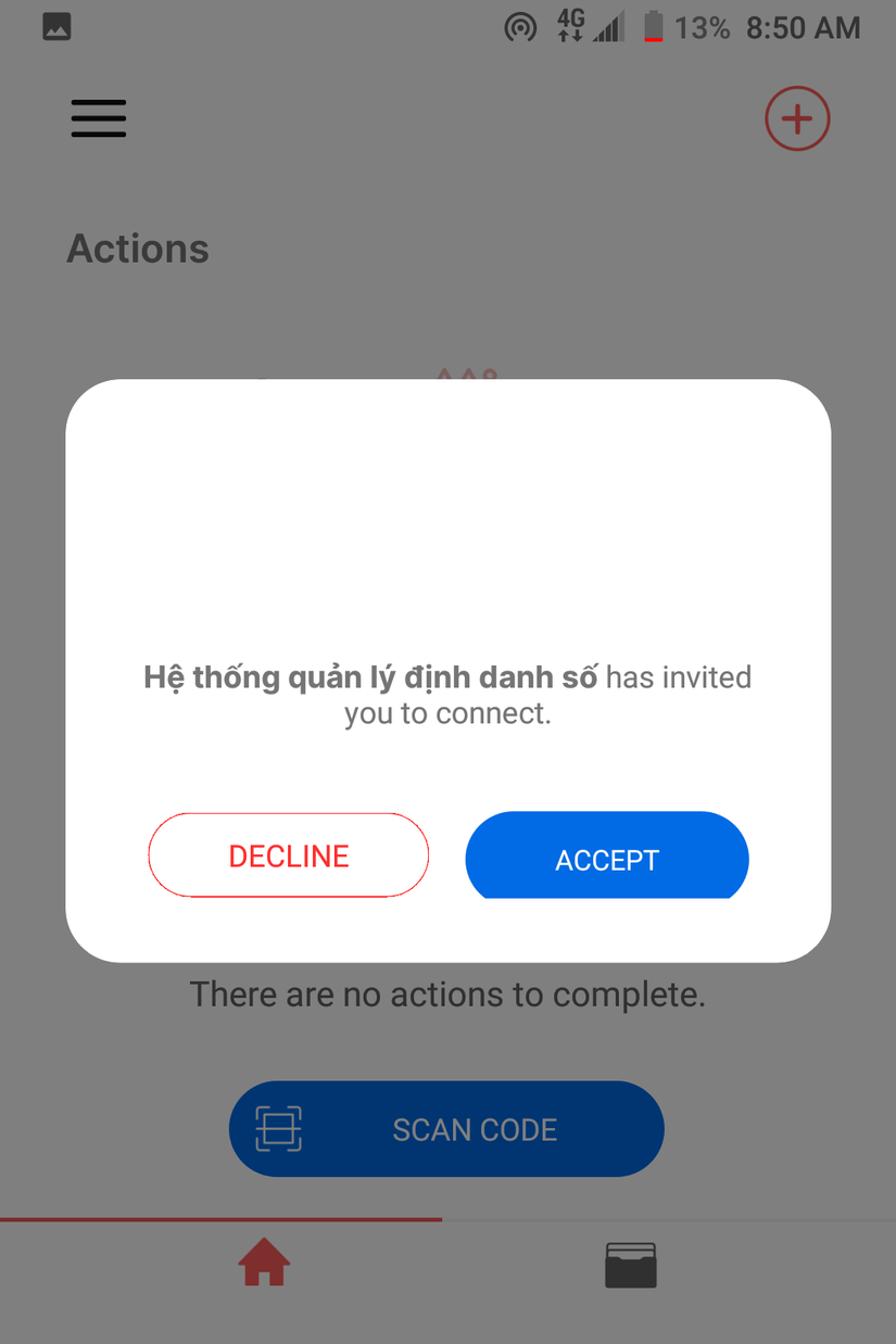 - Người dùng đồng ý kết nối, hệ thống sẽ gởi đề nghị nhận chứng chỉ cho người dùng.