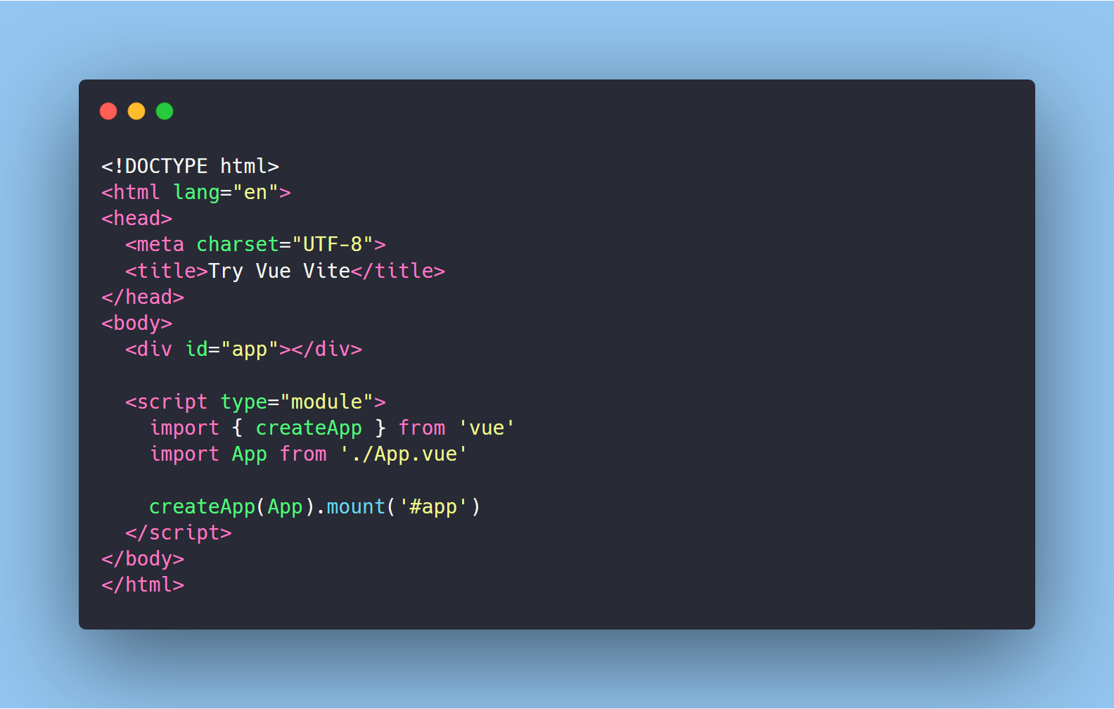 Tiếp tục tạo 1 file tên index.html cùng cấp với file App.vue vừa nãy với nội dung như sau: