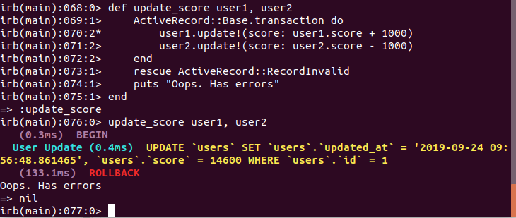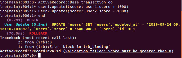 Như ta thấy Rails bắn ra exception và transaction bị ROLLBACK, vì score không chấp nhận giá trị nhỏ hơn 0.