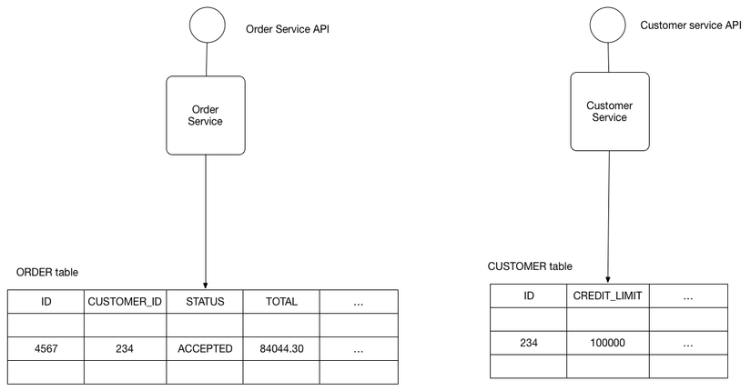 Thử tưởng tượng bạn đang xây dựng một hệ thống bán hàng online, sử dụng kiến trúc microservices. Hầu hết các service đều thực hiện tác vụ truy vấn và lưu trữ dữ liệu. Ví dụ như service Order xử lí việc đặt hàng, còn service Customer service thì xử lý các tác vụ liên quan đến thông tin khách hàng - (hình minh họa bên dưới). Vấn đề đặt ra ở đây là chúng ta sẽ lựa chọn kiến trúc database như thế nào cho ứng dụng trên ?