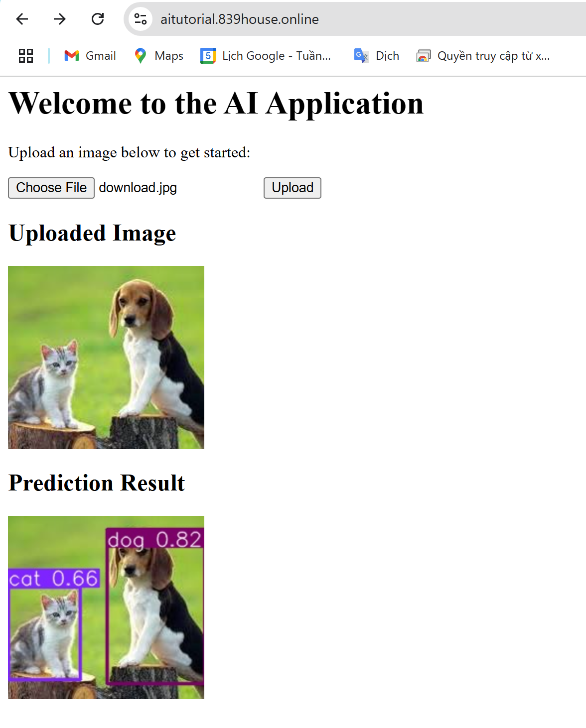 detect.pyđể thực hiện quá trình phát hiện, nhập và gọi hàm từ module này.from fastapi import FastAPI, File, UploadFile from fastapi.responses import HTMLResponse from detect import ModelHandler #add module import shutil import os app = FastAPI() model = ModelHandler('models/yolov8n.pt') @app.get("/", response_class=HTMLResponse) async def read_root(): with open("templates/index.html") as f: return HTMLResponse(content=f.read()) @app.post("/upload/") async def upload_image(file: UploadFile = File(...)): """Xử lý ảnh upload và trả về kết quả dự đoán""" upload_dir = "static/uploaded" predict_dir = "static/predict" os.makedirs(upload_dir, exist_ok=True) os.makedirs(predict_dir, exist_ok=True) file_path = os.path.join(upload_dir, file.filename) with open(file_path, "wb") as buffer: shutil.copyfileobj(file.file, buffer) results = model.predict(file_path) return { "uploaded_image": results["uploaded_path"], "predicted_image": results["output_path"], "predictions": results["predictions"] } if __name__ == "__main__": import uvicorn uvicorn.run(app, host="0.0.0.0", port=8000)Reload lại trang và kiểm tra thử bạn hãy chọn 1 file ảnh và nhấn
