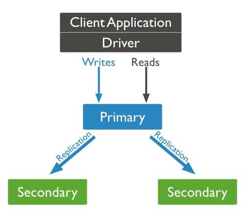 MongoDB sử dụng Replica Set để thực hiện Replication. Một Replica Set là một nhóm các sự thể hiện của mongodb mà host cùng tập hợp dữ liệu đó. Một replica set chỉ có duy nhất một primary. Primary member sẽ nhận các yêu cầu ghi. Primary ghi các thay đổi của nó vào oplog - một file có vai trò như binlog trên mysqld. Các secondary sẽ có chung data set với primary, các yêu cầu đọc có thể scale trên primary và tất cả các secondary. Một replica set có thể có tối đa là 50 member.