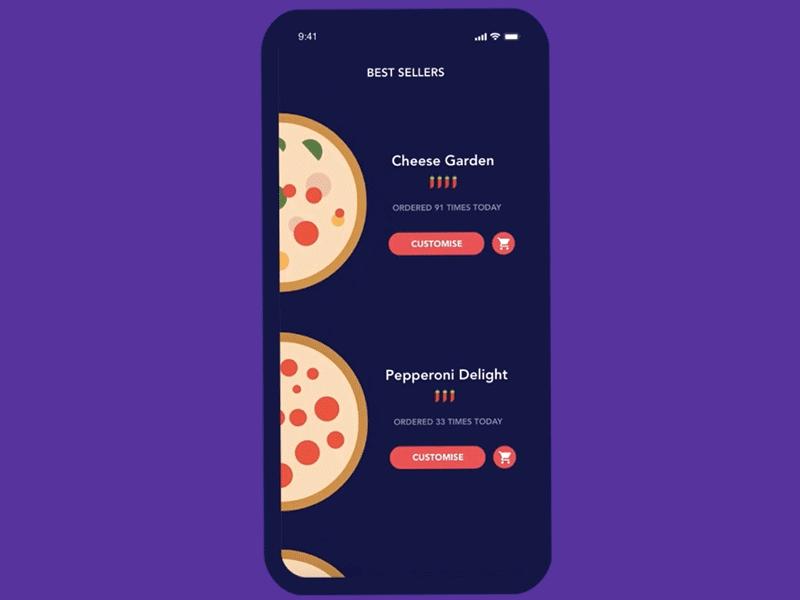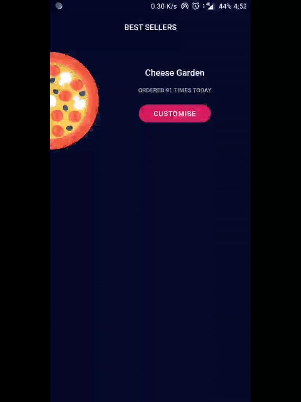Màn hình này đang hiển thị một danh sách các loại pizza và bằng cách nhấp vào nút CUSTOMIZE, ứng dụng điều hướng đến một màn hình khác với hình ảnh bánh pizza của màn hình hiện tại và đế bánh pizza của màn hình khác.