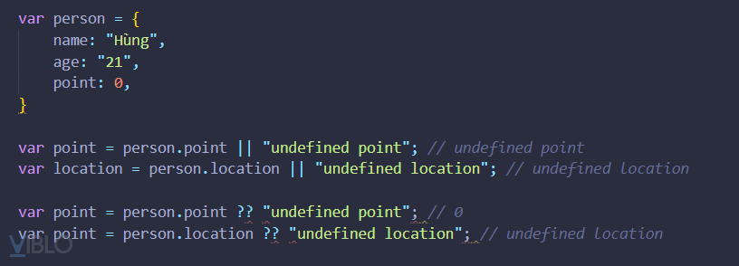 Một ví dụ nữa về Truthy và Falsy trong một ngữ cảnh Boolean. Ở đây toán tử || sẽ trả về toán hạng vế trái nếu vế trái là truthy còn nếu vế trái là falsy thì nó sẽ trả về toán hạng vế phải (cách này thường được dùng để cung cấp giá trị mặc định). Nhưng nó cũng sẽ xãy sau một số vấn đề như bên dưới mà bạn dễ dàng nhận thấy được nếu bạn coi 0, ‘’, NaN là hợp lệ. Như person.point ở đây có giá trị 0 (falsy) nên nó sẽ trả về toán hạng bên phải là undefined point gây ra kết quả không mong muốn. Cách khắc phục, nullish coalescing operator (??) là một tính năng mới được giới thiệu trong ES11(ECMAScript 2020). Theo định nghĩa của MDN ?? là một toán tử logic sẽ trả về toán hạng bên phải nếu vế trái là null hoặc undefined, và nếu không thì sẽ trả về toán hạn bên trái của nó. Như vậy nếu giá trị là 0, ‘’, NaN thì nó vẫn sẽ chấp nhận là các giá trị hợp lệ.
