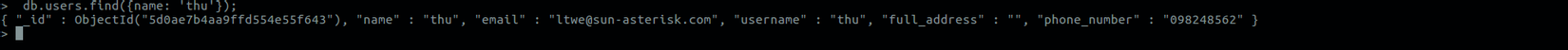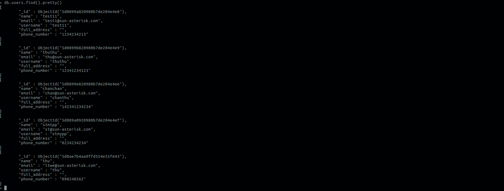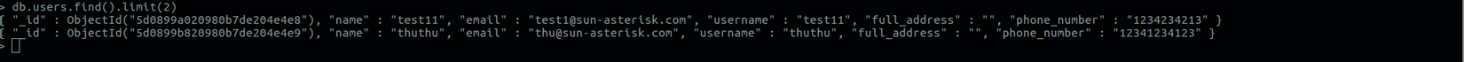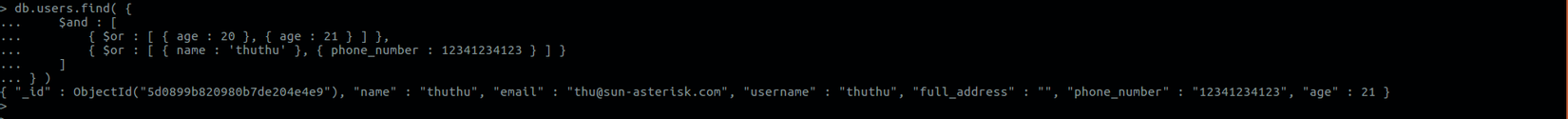 Cú pháp : db.collection_name.find() Khi không truyền vào tham số bên trong hàm find() thì nó sẽ lẩy ra tất cả document có bên trong của collection đó. Trong bài trước mình đã tạo 1 collection users. bây giờ mình sẽ thức hiện các thao tác truy vấn trên đó.