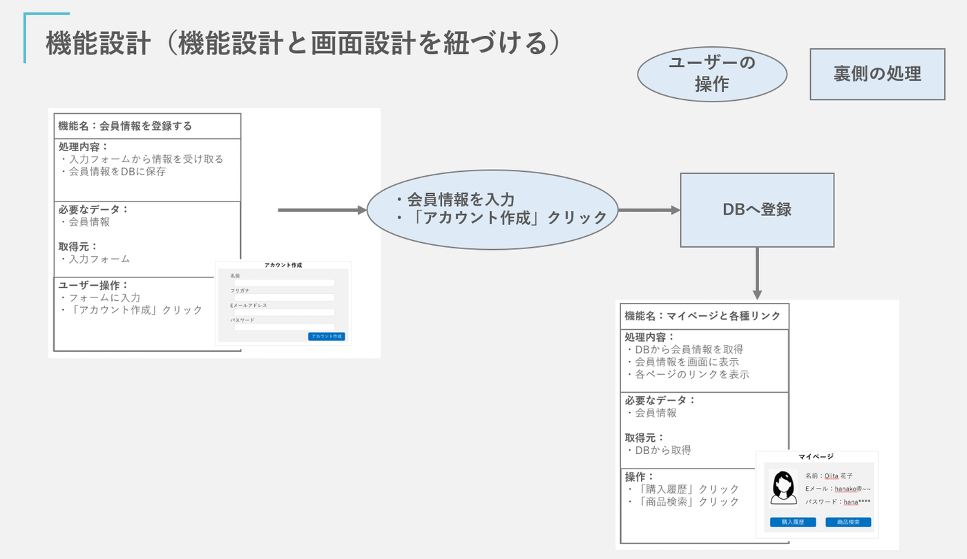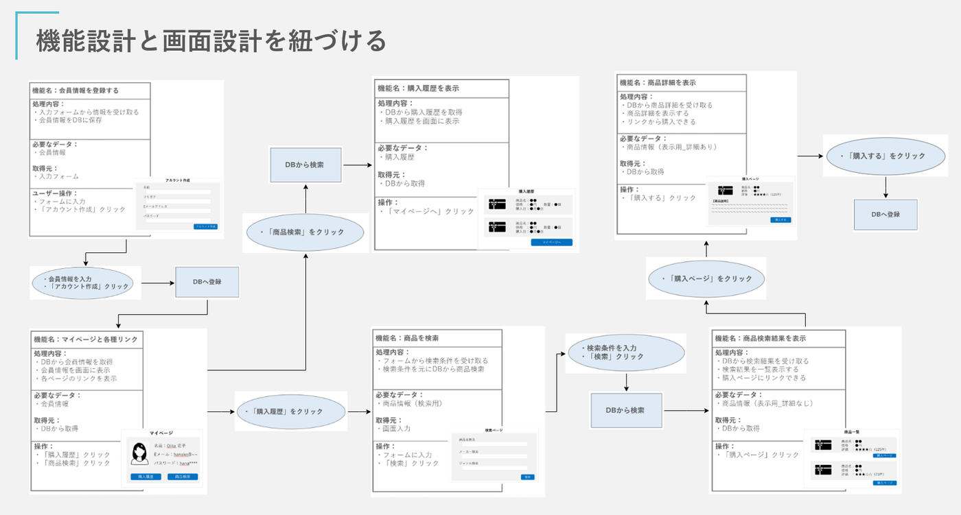 Để hoàn thiện thiết kế chức năng, hãy kết nối thiết kế màn hình và thiết kế chức năng. Hình dung loại thao tác người dùng và xử lý mặt sau đang được thực hiện giữa các màn hình.