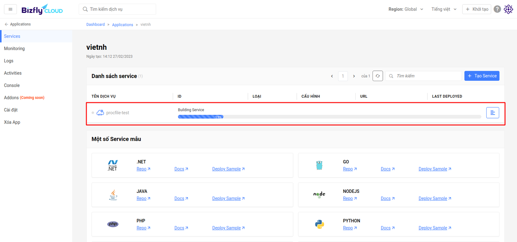 Quay trở lại trang quản trị service của bạn trên Bizfly App Engine, bạn sẽ thấy đã có một phiên bản mới được triển khai.