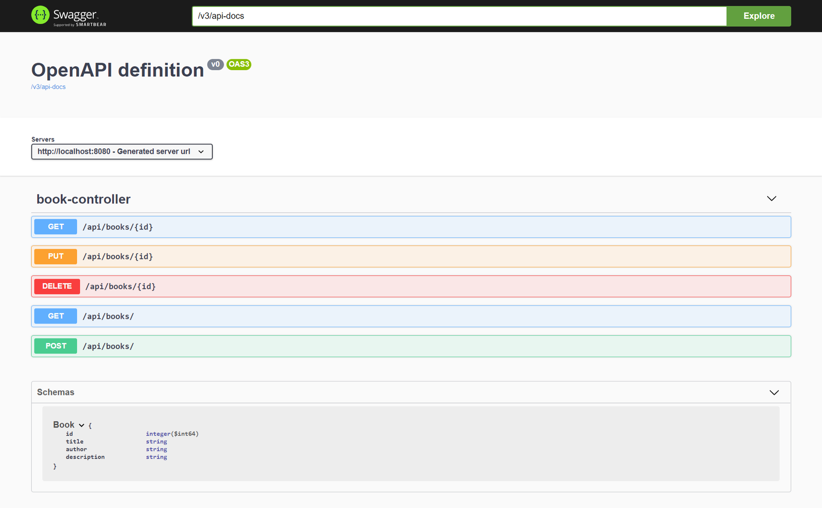 Springdoc sẽ quét các package được cho phép và tự viết tài liệu API theo các chuẩn cấu trúc của Spring. Với file controller BookController.java ở trên thì Swagger UI sẽ hiện như sau: