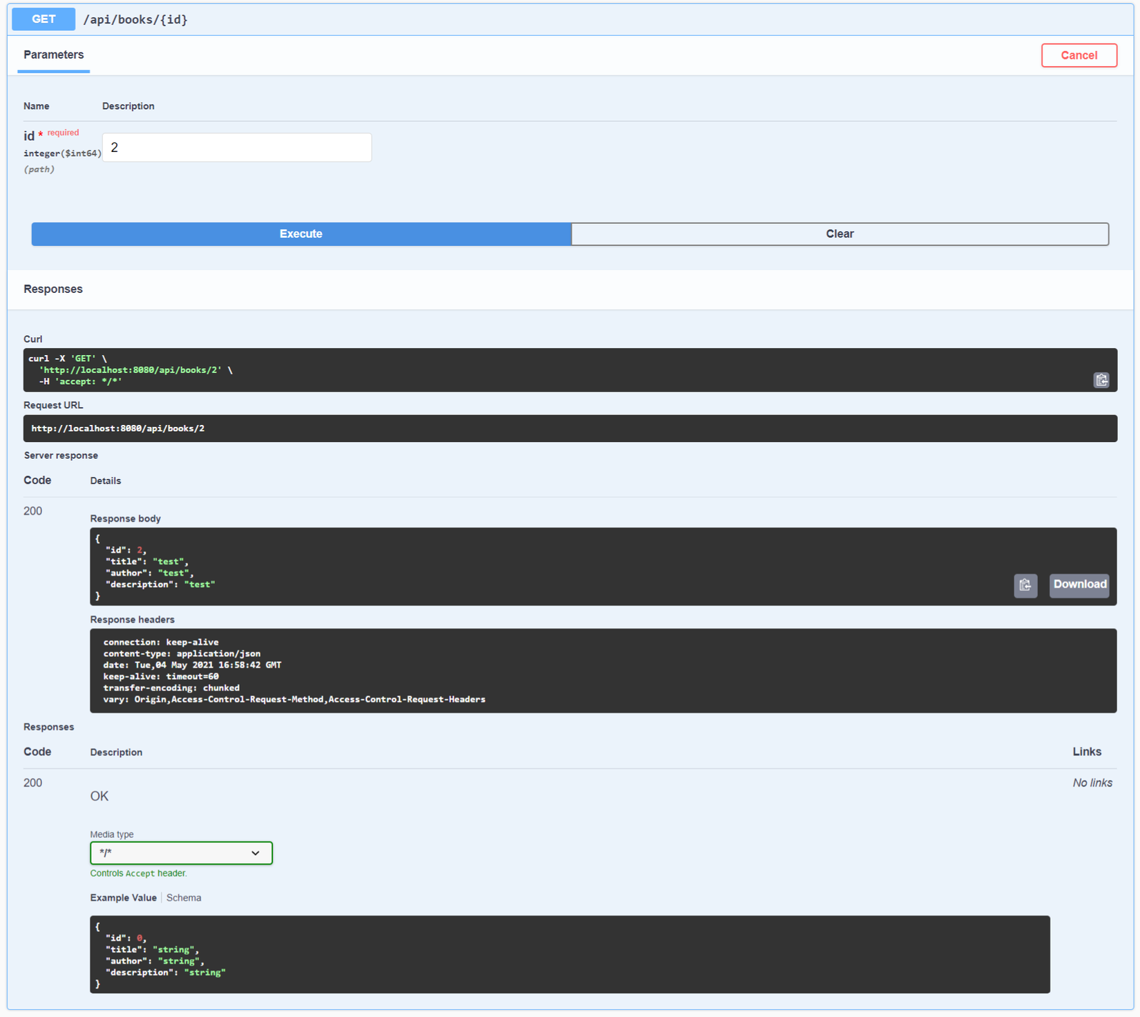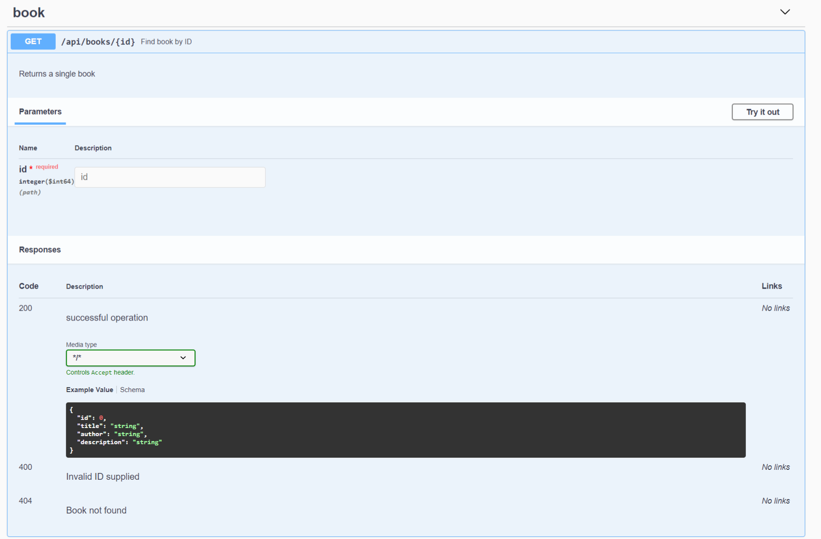 Chúng ta có thể thấy tất cả các endpoint của ứng dụng và Schema của Book. Khi mở ra xem endpoint /api/book/{id}, chúng ta có thể xem các chi tiết HTTP Request và Response: