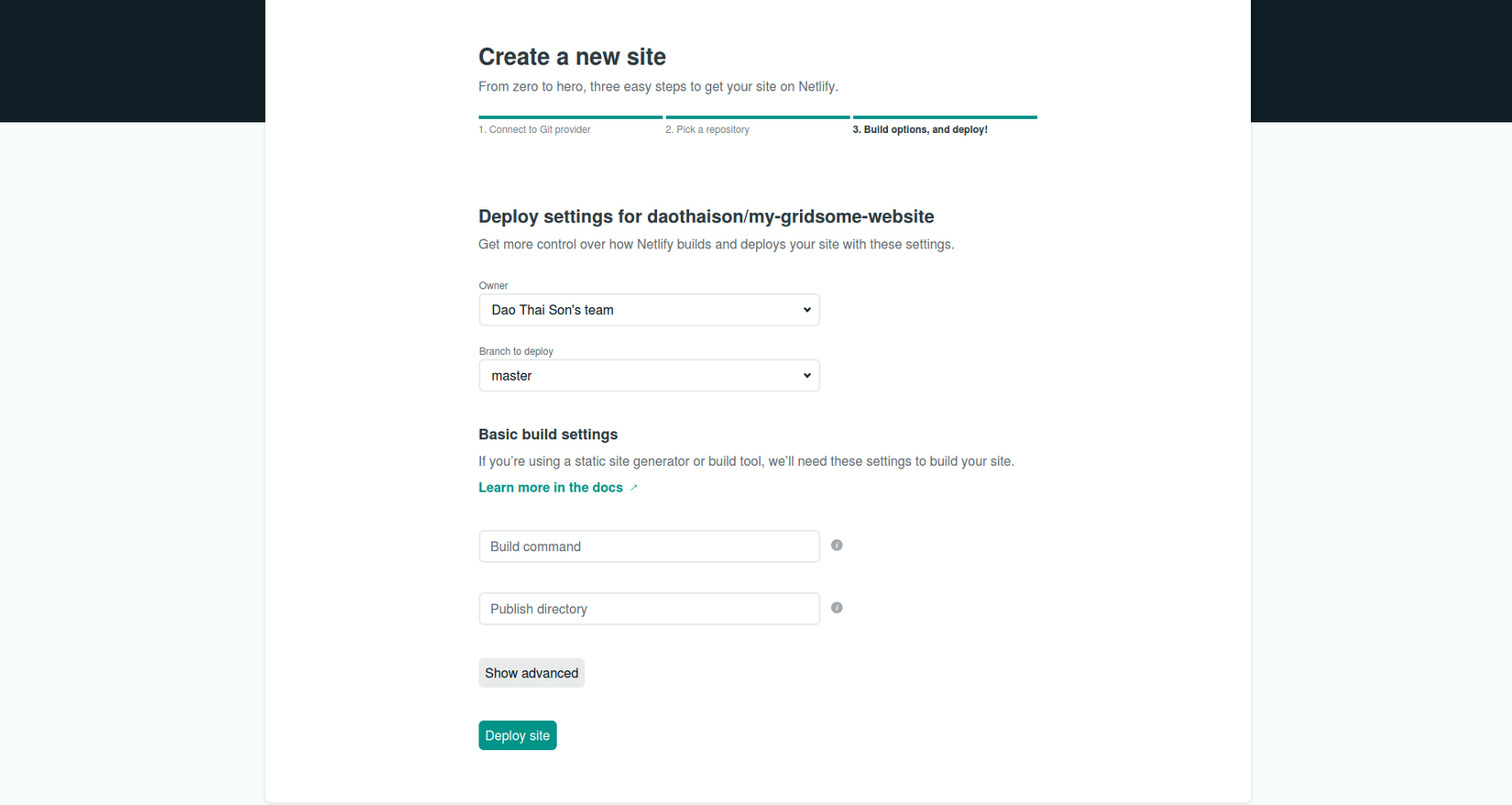 Ở đây mình sẽ triển khai chính website được dựng bằng Gridsome trong bài viết trước, vì thế mình sẽ điền