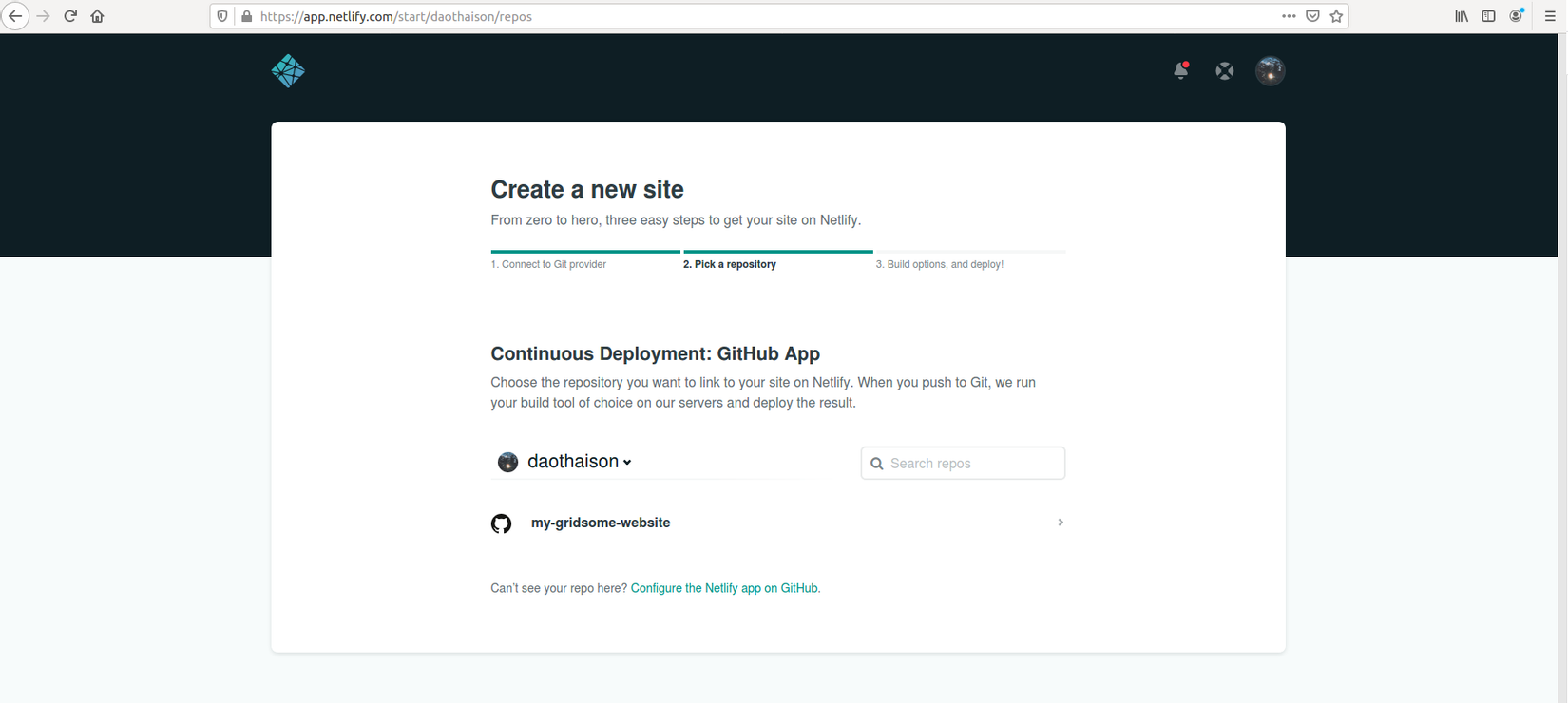 Bạn phải cho phép Netlify access vào tài khoản Github của bạn thông qua Github App, sau đó ở bước 2, bạn chọn Github Repository của website cần triển khai.