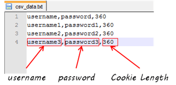 Đây là một ví dụ về CSV Data. Đó là một tệp văn bản chứa thông tin người dùng và mật khẩu để đăng nhập trang web mục tiêu của bạn