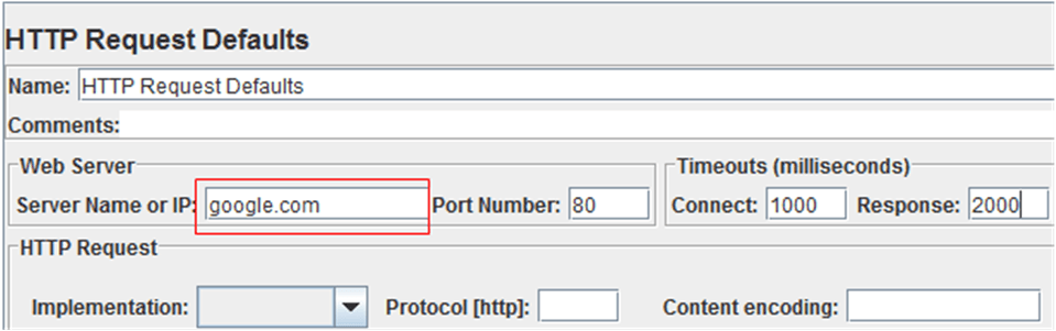 Nếu bạn muốn gửi nhiều request http đến cùng một máy chủ, hãy cân nhắc sử dụng HTTP Request Defaults Configuration Element để bạn không phải nhập cũng 1 thông tin Server Name or IP cho mỗi request