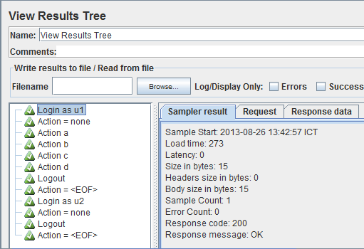 Functional Test Mode(i.e. save Response Data and Sampler Data) Nếu checkbox này được chọn, thì các thông tin của sampler requests (các requests gửi lên server) và response data (dữ liệu server phản hồi về) sẽ được lưu vào trong các listener (thành phần trong JMeter hiển thị các thông tin về request, response cũng như các thông số tính toán trong kiểm thử hiệu năng sẽ được nói chi tiết ở phần sau). Checkbox này cho phép chúng ta xác minh rằng kết quả trả về có đúng như mong đợi hay không.