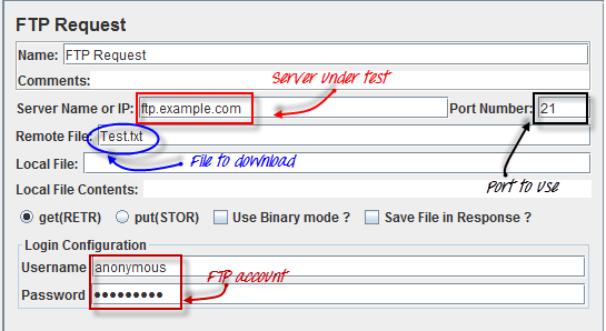 Ví dụ: nếu bạn muốn tải xuống tệp "Test.txt" từ máy chủ FTP đang thử nghiệm, bạn cần định cấu hình một số tham số trong JMeter như hình dưới đây