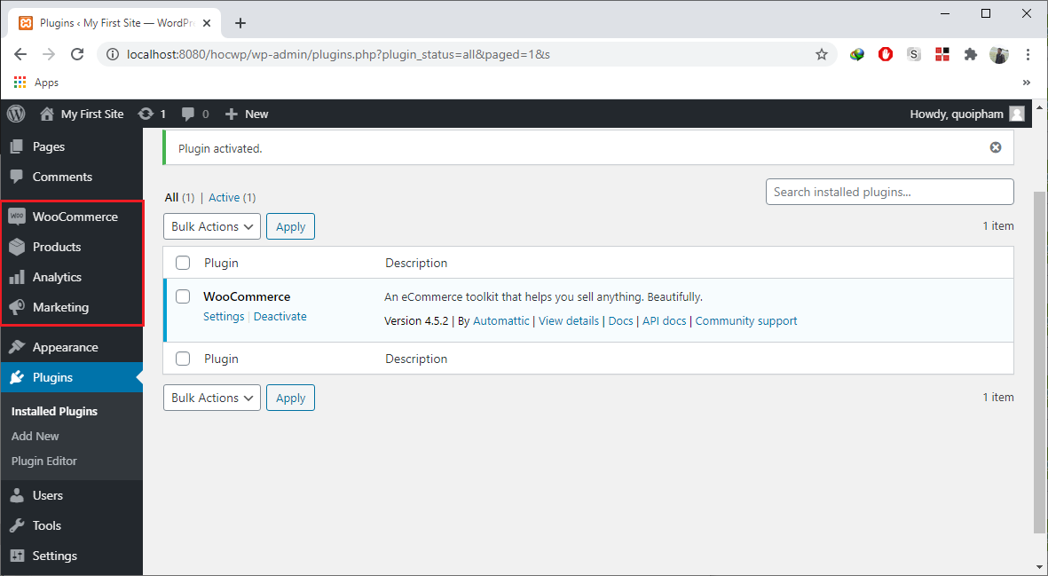 Sau khi đợi Install xong, lúc này bạn về lại mục Plugin sẽ thấy WooCommerce đã xuất hiện trong list Plugin. Bạn bấm vào Activate để kích hoạt WooCommerce. Sau đó bạn sẽ thấy menu bên trái của Dashboard được add thêm các item như: WooCommerce, Products, Analytics, Marketing.
