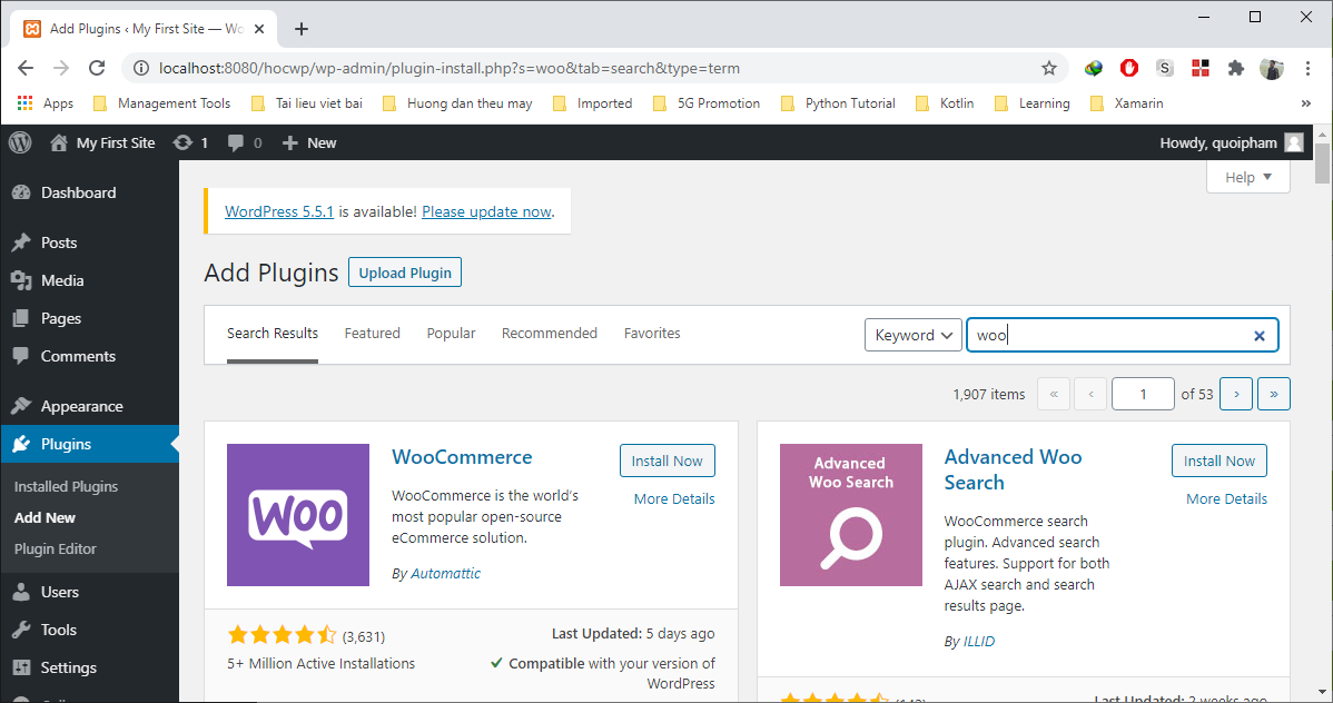 Sau đó bạn tìm WooCommerce, rồi bấm Install.