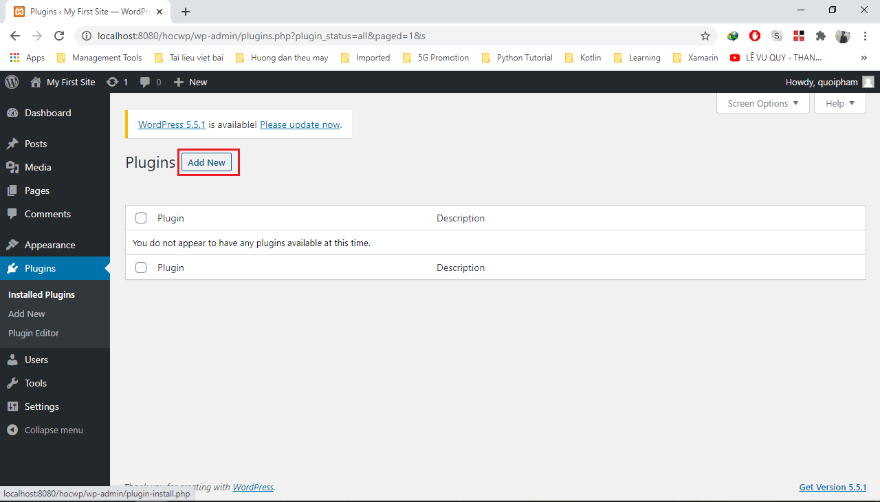 Bạn mở Dashboard như ở bài trước, mở vào mục Plugins, rồi chọn button Add New.