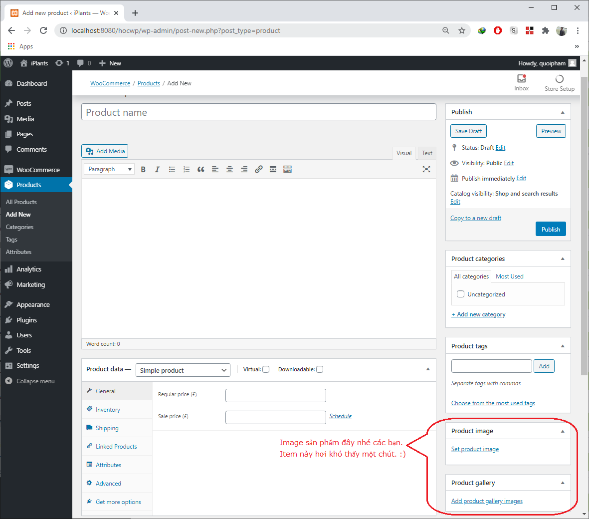 Bên phải là các ô cho phép bạn setting có publish sản phẩm lên website ngay hay không, chọn category cho sản phẩm, chọn tag cho sản phẩm, và Product image. Đây là chỗ để bạn upload hình ảnh cho sản phẩm đấy. Kế đến là Product gallery. Product image sẽ được hiển thị như là hình đại diện ở trang chi tiết sản phẩm. Tí nữa chúng ta sẽ kiểm tra lại.