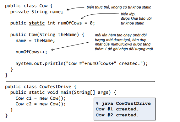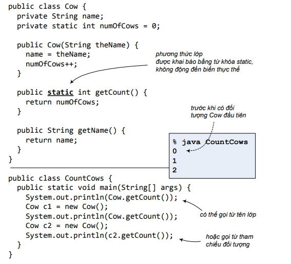 Ta thấy, bên cạnh biến thực thể name, lớp Cow còn có một biến lớp numOfCows với mục đích ghi lại số lượng các đối tượng Cow đã được tạo.