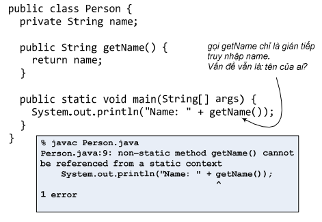 - Do không được gắn với một đối tượng nào, phương thức static không thể truy nhập biến thực thể hay các phương thức thực thể.