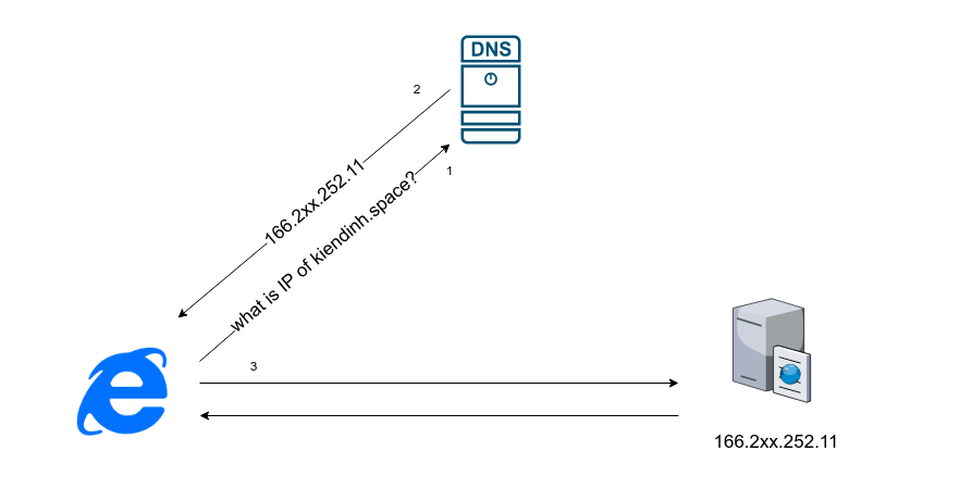 Hãy giả định như ta đang có tên miền kiendinh.space, thì trình duyệt (client) sẽ có flow từng bước như sau: