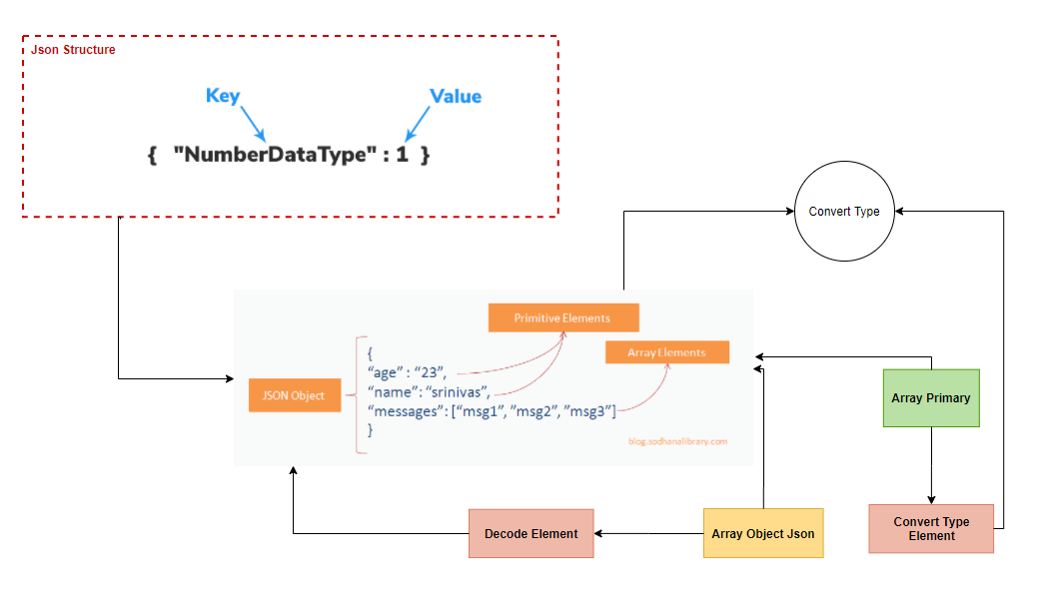 Key thì luôn là kiểu String rồi, giờ việc của mình là xác định ra được bao nhiêu loại Value của nó để convert cho đúng kiểu dữ liệu. Value trong JSON thì một là primary type: Số hoặc Chuỗi Loại thứ 2 là Array: Mảng này có thể là mảng của Primary Type hoặc là một mảng các Json Object khác, và cũng có thể là mix giữa 2 loại đó. (Loại mix khó quá, xử lý sau, chắc cũng hiếm khi gặp)