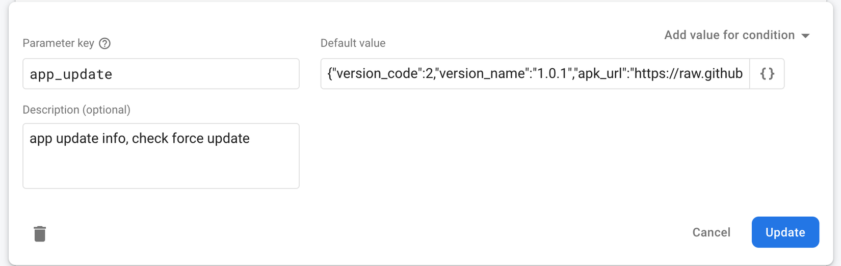 - Dùng Firebase remote config để trả về thông tin phiên bản mới