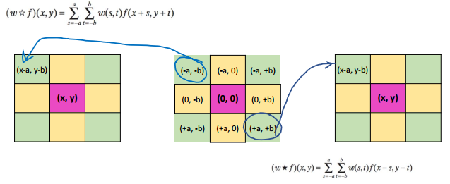 Biến đổi ảnh tuyến tính thực hiện thao tác tính tổng các tích giữa hình ảnh f và filter kernel w và thay giá trị điểm ảnh đó bằng giá trị tổng vừa tìm được. Lưu ý rằng vị trí hệ số w(0,0) trùng với vị trí điểm ảnh f(x,y) đang cần biến đổi.