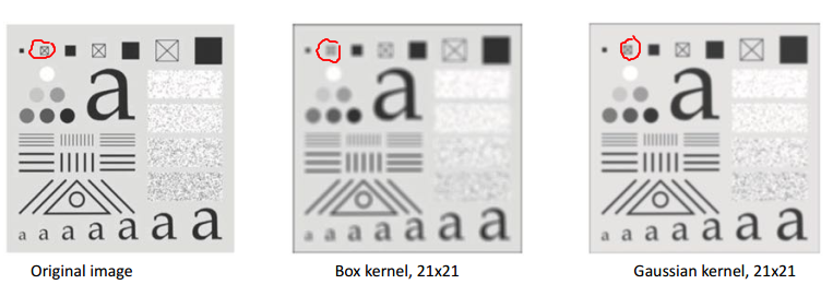 Mọi người để ý vào vùng mình khoang tròn sẽ thấy với kernel cùng kích thước thì box kernel sẽ làm mờ và biến đổi hình dạng của ảnh còn với Gaussian kernel thì chỉ làm mờ. Vì thế trong xử lý ảnh, khi muốn làm mịn ảnh người ta hay dùng Gaussian kernel hơn.