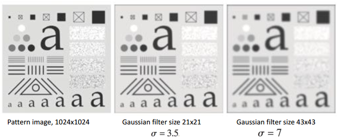 Một số ví dụ sử dụng Gaussian filter với các kích thước và độ lệch chuẩn khác nhau với K = 1 trong tất cả các trường hợp.