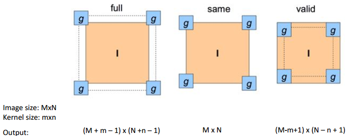 Khi ta làm việc với ảnh làm việc với tích chập, một vấn đề xuất hiện là khi nhân kernel g với ảnh f thì g sẽ bắt đầu nhân với pixel ở ví trị nào ? Có 3 dạng như sau:
