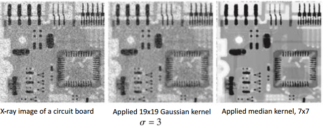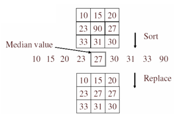 Median filter thay thế giá trị của pixel trung tâm bằng trung vị của các giá trị cường độ trong vùng lân cận của pixel đó. Nó có tác dụng giảm noise tuyệt với trong cac stường hợp như nhiễu ngẫu nhiên hoặc salt-and-pepper noise.